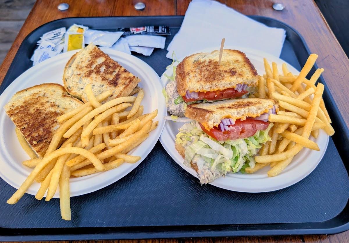 Much better than the ratings show. Reasonable prices for the pier, breakfast meals plus tons of fish choices, fish tacos (or tri-tip or chicken), salads, tuna melt, etc. Delicious oceans views, eat indoor or out.