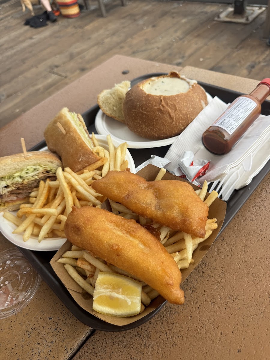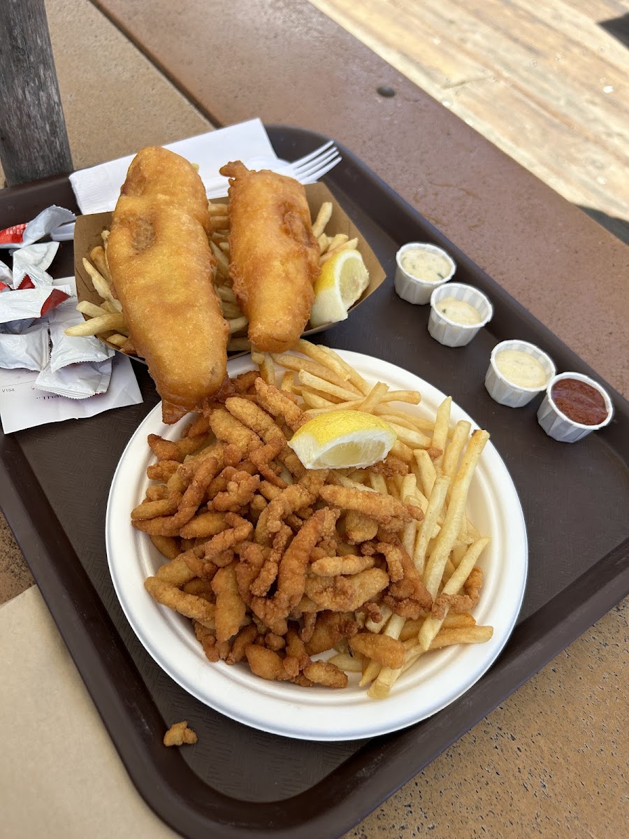 Excellent casual beach grub and DOG FRIENDLY!! If you’re traveling with your pup and enjoying some time on the pier this is a great little spot for lunch. Lots of open seating patio tables to choose from. We went on a Monday so it was easier to find a table. Assuming the weekends are more crowded. Batter on the fish and chips was crispy and delicious. Clam chowder was excellent! I love that they don’t ruin the clam chowder by adding bacon. And we got a steak sandwich which was fine but we’d swap that for a burger next time. Overall really good spot for lunch! Keep in mind this place is super casual and counter service only. That was perfect for what we were looking for. However, there’s plenty of other options on the pier and in Santa Barbara if you want to sit down and have higher end service. If you’re looking for a quick, yummy, a casual lunch then this is def a great spot for you.